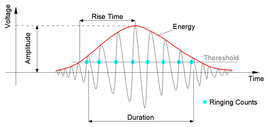 AE technology can be used to reflect the subtle changes and evaluate the mechanical and physical behaviors inside materials at the microscopic level by analyzing the characteristics of signals. Some basic AE parameters are shown in Figure 1, including amplitude, energy, rise time, and duration.