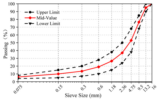 In this experiment, the asphalt with a 70 penetration grade was used, which was from Dongqi Petrochemical Industry of Chongqing, Chongqing, China; limestone was used as the aggregate and mineral filler. According to Standard Test Methods of Bitumen and Bituminous Mixtures of Highway Engineering (JTG E20-2011), the target aggregate gradation was designed as the mid-value between the upper and lower limits, as shown in Figure 2.