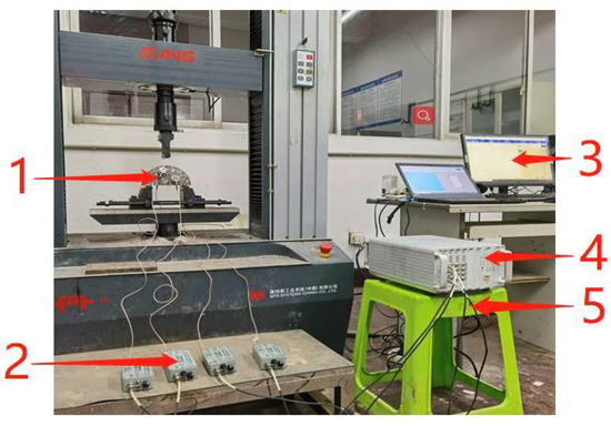 AE test system: 1: G8 sensors; 2: Preamplifier; 3: Computer; 4: High-speed digital AE detector; 5: Cable.