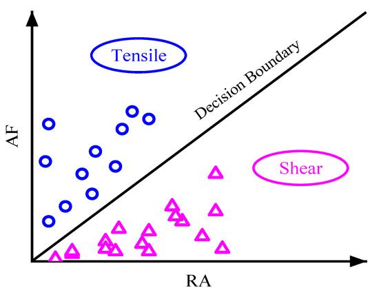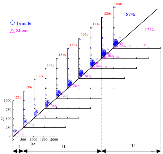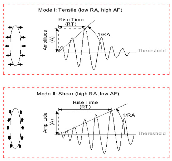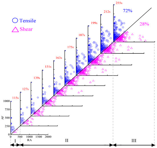 As shown in Figure 7 and Figure 8, when the specimen is damaged, there will be different fracture modes including tensile crack and shear crack occurring inside the material; what’s more, the different shapes of AE waveforms are associated with different fracture modes. Tensile modes are corresponding to high energy, high amplitude, and have a short rise time and duration time, leading to lower RA and higher AF value. Conversely, shear modes show low frequency and longer rise time and duration time, resulting in higher RA and lower AF value [30].
