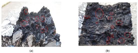 As can be seen from Figure 9, the basalt fibers on the fracture section were marked by red circles. A large number of basalt fibers were well-distributed and exposed on the fracture section, indicating that the basalt fibers had great internal dispersion and were uniformly distributed in the specimen before fracture, which is of great help in improving the crack resistance performance of the specimen.