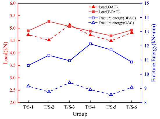 From the perspective of fracture mechanics, the fracture energy is used to represent the work done by unit area crack expansion to unit length. In the semi-circular bending test, the area enclosed by the load-deflection curve and the coordinate axis is the fracture energy [31]. The failure load and fracture energy of S1–S6 of OAC and T1–T6 of BFAC are shown in Figure 10.