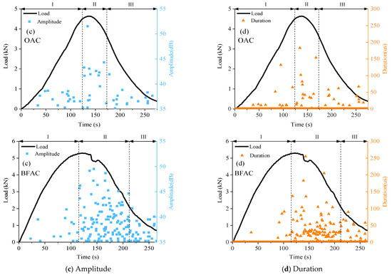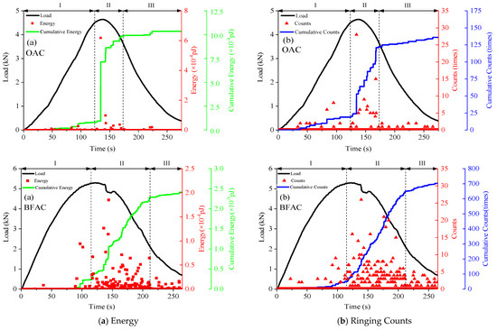 As shown in Figure 11, basic AE parameters of OAC and BFAC during the test are collected and analyzed, including duration, ringing counts, and cumulative ringing counts, which can reflect the number of AE activities, while amplitude, energy and cumulative energy reflect the strength [32,33,34,35]. Synthetically analyzing and considering the variation characteristics of each AE parameter, the whole process of OAC and BFAC fracture damage can be divided into three stages: I: microcrack initiation stage, II: rapid fracture stage, III: residual stage.