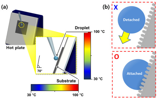 High water vapor pressure at the droplet surface causes moisture to penetrate between the nanoscale structures covering the substrate surface, resulting in the surface becoming wet. For the superhydrophobic surface with a micro/nanoscale surface structure, the attachment and detachment of droplets were tested by varying the surface and droplet temperatures from 30 °C to 100 °C.