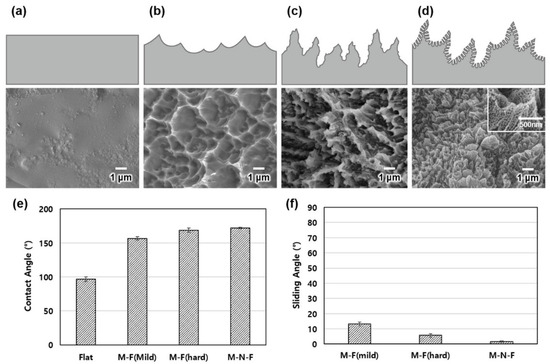 Cross-sectional diagrams and SEM images of the (a) original Ti, (b) mild-etched Ti M-F, (c) hard-etched Ti M-F, and (d) Ti M-N-F surfaces. (e) Contact and (f) sliding angles for the different Ti surfaces.