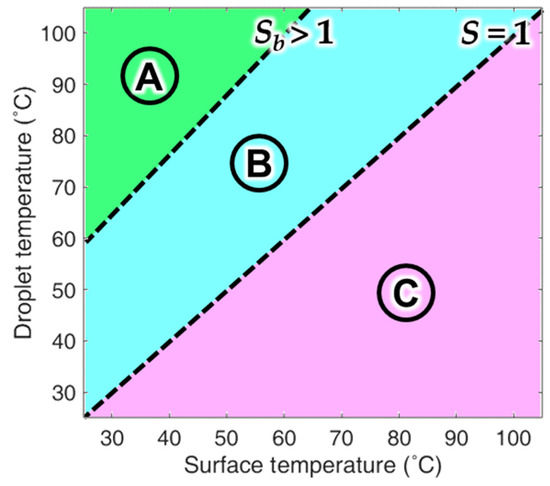 Figure 3 shows an example of a DB map that is divided into three zones based on the supersaturation degree and the critical temperature boundary at which the droplets are attached [44]. In theory, condensation can occur in an environment with S > 1; therefore, condensation does not occur naturally in zone C in Figure 3. By contrast, condensation occurs in zones A and B, where S > 1. Meanwhile, Sb refers to the boundary line between zones A and B, where Sb > 1. Based on Sb, dropwise condensation occurs in zone B (where Sb > S > 1) and attached condensation occurs in zone A (where S > Sb). In a previous study, DB mapping was performed with superhydrophobic aluminum. The superhydrophobic aluminum tube was manufactured and tested in an actual condenser environment and it showed an average improvement of 105% in terms of heat exchange performance in zone B. However, under the conditions in zone A, attached condensation was observed and the performance was reduced by 20% compared to a typical aluminum tube. Additionally, the surface that had undergone attached condensation in zone A did not recover its performance even when it was subsequently subjected to the conditions in zone B. It only showed the original improved condensation performance after it completely dried.
