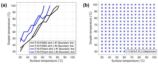 Two samples were fabricated for each of the surface structures investigated in this study, with Figure 4 showing the DB mapping results for each surface. The DB maps corresponding to mild etched and hard etched M-F surfaces demonstrate that the boundary line of the hard-etched M-F surface, which possesses higher structural complexity and a smaller gap size, is observed at a higher value in comparison to the mild-etched M-F.