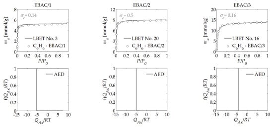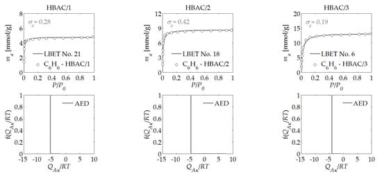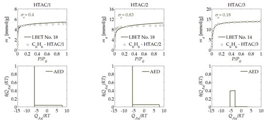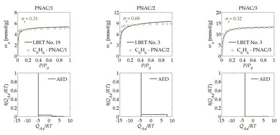 Based on the above-mentioned benzene adsorption isotherms, the following parameters were determined: the specific surface area SBET, which was calculated via the Brunauer–Emmett–Teller (BET) equation [], the volume of micropores VDR, as calculated via the Dubinin–Radushkevich (DR) equation [], the total volume of pores VT, as calculated via the maximum benzene adsorption at P/P0 = 0.96, as well as the volume of the first adsorbed layer VhA (cm3/g), the energy parameter for the first adsorbed layer QA/RT, the energy parameter for the higher adsorbed layers BC, the geometrical parameters of the porous structure that determined the height and width of the adsorbate molecule clusters (α and β, respectively), the surface heterogeneity parameter h, the adsorption energy distributions on the first layer, and the identification index wid, which was obtained via a new numerical-clustering-based adsorption analysis (LBET) method [,,,].