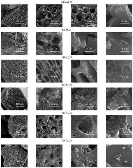 The results of the investigations carried out using scanning electron microscopy showed a correlation between the morphology of the material from which the activated carbons were obtained and their adsorption properties. In particular, from the results of SEM imaging, significant similarities could be observed in the morphological structures of the activated carbons obtained from mahogany wood (MAAC/3), ebony wood (EBAC/3), and hornbeam wood (HBAC/3) (see Figure 7).