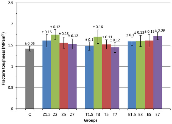 The means and standard deviations of fracture toughness are outlined in Figure 2 and Table 3. The results of ANOVA showed that there was a significant difference (p < 0.05) in fracture toughness between the groups that contained filler/fibre and the unfilled group, C (1.42 ± 0.06 MPa.m1/2). The fracture toughness of the specimens in the group that was filled with a 3 wt.% ZrO2 nanoparticle significantly increased (1.75 ± 0.12 MPa.m1/2) by 23.2% in comparison with the fracture toughness of the control group and thus, achieved the highest mean fracture toughness among the reinforced groups. Furthermore, the mean fracture toughness was statistically (p < 0.05) higher in Groups Z1.5 and T3, and all E-glass fibre-modified groups in comparison to the control group. The mean fracture toughness in the remaining reinforced groups was increased slightly higher than the control group; however, the differences were not statistically significant (p > 0.05).