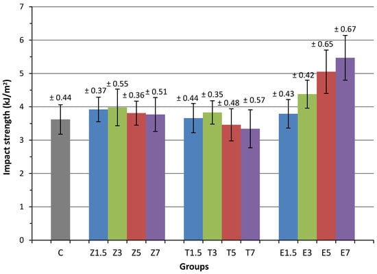The groups in which 1.5 wt.%, 3 wt.%, 5 wt.%, and 7 wt.% E-glass fibre were introduced into heat-cured PMMA acyclic exhibited a higher impact strength by 4.7%, 21%, 39.5%, and 51.1%, respectively. These increases were all statistically significant, with the exception of the 1.5 wt.%. A significant difference (p > 0.05) was found between Groups E1.5/E5, E1.5/E7, E3/E5, and E3/E7. However, there were no significant differences in impact strength between Groups E1.5/E3 or E5/E7.