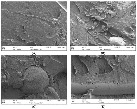The control specimen exhibited a smooth surface and small pores on the SEM micrograph. This indicated that it had a brittle mode of fracture (Figure 4A). The 7 wt.% ZrO2 nanoparticle specimen showed fracture surfaces that were less brittle fracture due it their comparatively irregular rough surface in comparison to the specimens in the control group as seen in (Figure 4B). Small voids and minor agglomerations were observed on the fracture surface of the specimens in the 7% TiO2 nanoparticle group (Figure 4C), which is indicative of a poor level of interaction between the TiO2 or ZrO2 particles and the PMMA matrix. The fracture surface of the E-glass fibres specimen presented a good level of bond between the matrix and the fibres. No gap formation was observed around the fibres (Figure 4D). This indicated that the fibres were more effectively impregnated within the PMMA matrix.