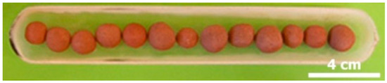 For the individual thermal treatment of the three reagents (W-PVC, P-PVC, and clay) at different temperatures, about 5 g (except otherwise indicated) of powder sample was spread out uniformly in a silica boat and used directly. For the thermal process of the PVC-hematite samples, the preparation consisted first in mixing W-PVC, hematite, and clay with water to get a pasty material that was then hand-conditioned as pellets of centimetric size. Hence, the obtained pellets were dried in an oven at 70 °C for 48 h prior to their thermal treatment. A photograph of several pellets composed (35% W-PVC + 35% hematite + 30% clay) inside the experimental quartz boat used for this investigation is displayed in Figure 1.