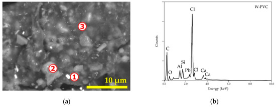As revealed previously [9] by SEM-EDS analysis, the pure PVC (P-PVC) sample is composed of chlorine and carbon (hydrogen not analyzed by this technique). As aforementioned, the PVC resin has the raw chemical formula (C2H3Cl)n but other chemicals are added to enhance the functional properties of the bearing PVC materials. A general SEM image and overall EDS spectrum of the PVC waste (W-PVC) are provided in Figure 3. The W-PVC sample (Figure 3b) has a rather multi-elemental composition. Detailed microanalysis as summarized in Table 1 showed the presence of O, Al, Si, Ca, Sb, and Pb as the main PVC constituents apart from chlorine. Lead (spot n° 1 and n° 3) belongs to the lead-based stabilizers for plastic resins, while calcium-bearing compounds distributed throughout the sample are used as the main filler for plastics. Aluminum and silicon oxides are regular constituents of glass fiber-reinforced plastics, while antimony (spot n° 1 and n° 3) is introduced in the plastic for its synergic effect in conjugation with halogens to obtain the fire inhibition property.