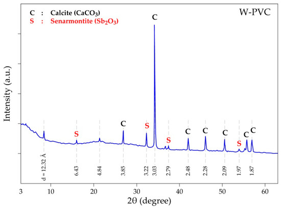 X-ray diffraction (XRD) patterns of the W-PVC sample (Figure 4) exhibited mostly the characteristic peaks of the crystallized mineral phases such as calcite (CaCO3) and senarmontite (Sb2O3), agreeing fairly with the results of SEM-EDS analyses, while the organic matter seems to have an amorphous nature resulting in several small and broad halos in the X-ray diffractogram of the W-PVC sample.