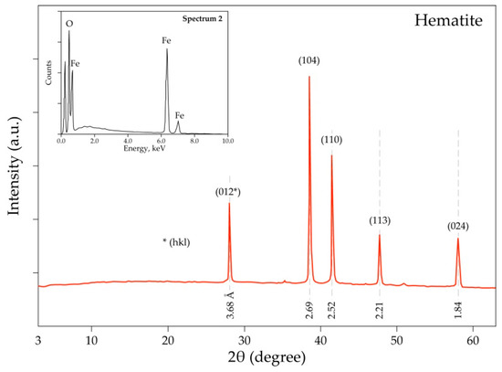 The crystallinity of the hematite sample was determined using XRD and the diffractogram is drawn in Figure 5. It detects the presence of only α-Fe2O3 as a main phase, confirming the microanalysis performed by SEM-EDS showed in the miniaturized spectrum in Figure 5, as well as the chemical characteristics of the hematite sample provided by the supplier.