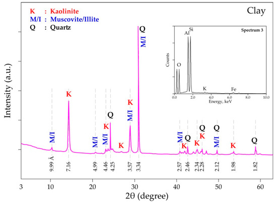 The qualitative elemental and mineral compositions of the clay sample revealed by SEM-EDS and XRD measurements, respectively, are summarized in Figure 6. The main constituents of the studied clay specimen were kaolinite [Al2Si2O5(OH)4], micas {Al2[AlSi3O10(OH,F)2K]-muscovite; Al(2−x)(Mg,Fe)xSi3Al)(K,H3O)xO10[(OH)2,(H2O)]-illite}, and quartz (α-SiO2), while the main elements revealed by SEM-EDS (miniaturized spectrum in Figure 6) consist of Si, Al, O, K, and Fe.