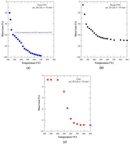 The thermal treatment of the two plastics (P-PVC and W-PVC) and clay sample was performed from 225 °C to 900 °C under air with a flow rate of 20 L/h. A short dwelling time (15 min) was chosen in order to better highlight the inherent effect of temperature on the occurring reactions. Results expressed as evolution of % mass loss (%ML) versus temperature for the three samples are grouped in Figure 7. Hematite does not undergo any thermal transformation in this temperature range.