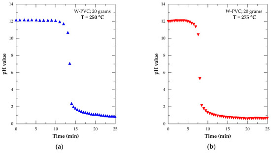 The pH value evolution versus the time of a solution scrubbing the outlet gas treatment of 20 g of W-PVC in the air atmosphere: (a) treated at 250 °C and (b) treated at 275 °C.