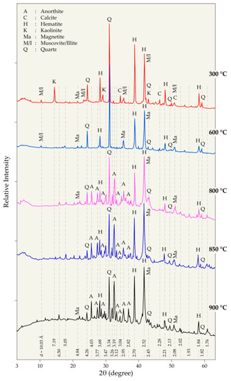 The increase in temperature at 850 °C and 900 °C for the thermal treatment of pellets at 30 min did not lead to any significant qualitative change of crystallized phases; anorthite, hematite, magnetite, and quartz are still predominant phases of both residues (Figure 10). Micas (muscovite and illite) was no longer detected due to the breakdown of their structure at high temperatures.