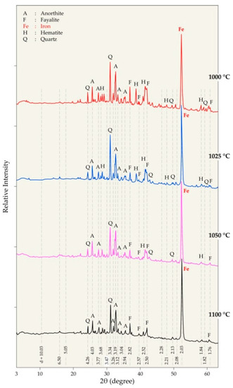 The analysis of the XRD diffractograms for the residues obtained at high temperatures (Figure 11) confirmed the presence of metallic iron at all treatment temperatures between 1000 °C and 1100 °C. Anorthite and quartz are also the main phases in the products, while only a weak peak of hematite is detectable in the diffractograms. Wüstite (FeO) is not revealed by XRD, however the fayalite (Fe2SiO4) induces a predominant phase in the residues.