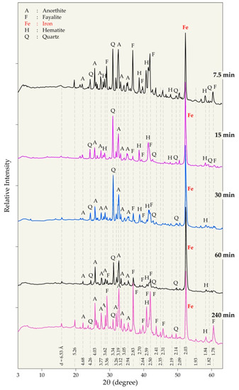 The effect of the reaction time on the phase composition of the pellet mixtures heated at 1025 °C is provided in Figure 12. The formation of metallic iron is clear for a 7.5 min dwelling time at this temperature. Similarly, anorthite and fayalite are synthetized for a short time indicating the high reactivity of their constituents. The increase in processing time did not result in significant differences in the composition of the residues except for the 4 h processing time for which there are more developed peaks for the fayalite phase.