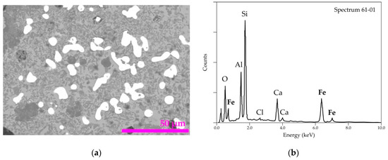 It was deemed interesting to investigate the morphological aspects and punctual composition of the residues using the SEM-EDS. Figure 13a shows a SEM image of the cross-section of a pellet treated at 1025 °C for 60 min. The difference in the phase contrast is obvious in the SEM image. Furthermore, the rounded shape of the almost-white particles suggests that a liquid phase was formed during the treatment. The general EDS spectrum provided in Figure 13b displays the main elements of the analyzed areas. Note that the identification of chlorine that is probably associated with calcium (as CaCl2) synthetized during the de-chlorination process and remained in the residue.