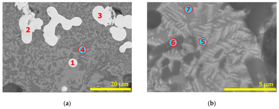 SEM micrographs (BSE image) of the (hematite + W–PVC + clay) sample treated at 1025 °C for 2 h: (a) general view of the obtained residue and (b) greater magnification in an area having a complex composition. The numbers 1 to 7 indicate the locations of microanalysis.