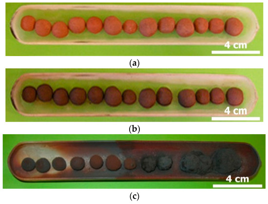 Another series of experimental tests were conducted at 1050 °C using pellets of the same composition (i.e., 35% hematite + 35% W-PVC + 30% clay). In these trials, air with a flow rate of 2.5 L/h was used. Figure 17 displays the boat with the pellets at the initial state, (a) treated at 300 °C and (b) 1025 °C (c) in an air atmosphere for 30 min. It is obvious that most of the pellets shrunk after their treatment at 1050 °C. In addition, those in front of the air inlet are twinned and merged probably due to the high exothermic nature of the reactions of oxygen with hydrocarbon and carbonaceous materials (char). The shrinkage of the pellets was observed from 1000 °C in almost all experimental tests and due probably to particle sintering and/or to the fusion of some components of the pellets. It is believed that the shrinking of the pellets allowed for good contact of oxides with the reducing agents, thus improving the reduction process.