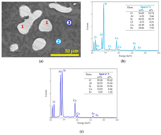 SEM-EDS results of the (hematite + W-PVC + clay) sample treated at 1050 °C for 30 min in the air atmosphere: (a) general view (BSE micrograph) of the obtained sample; (b) EDS analysis of spot n° 2; and (c) EDS analysis of spot n° 3.