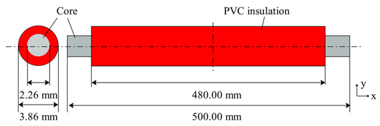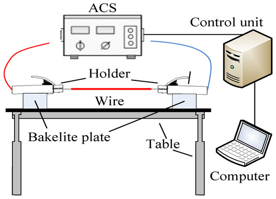 The experimental device comprises an alternating current source (ACS) and a control unit, as shown in Figure 1. The experimental wires included AA8176 aluminum alloy wires and Al wires commonly used in the industry. The chemical composition of the wires is shown in Table 1, where the data are sourced from the wire manufacturer (Zhongde cable, Shijiazhuang, China). Figure 2 shows a schematic diagram of the experimental wire structure. The diameter of the wire is 4 mm2, the rated current is 32 A, each section of wire is 500 mm long, and 10 mm of the insulation layer is stripped off at both ends for connection to the experimental device.