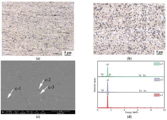 Figure 3 shows the microscopic characteristics of wires under different conditions. Figure 3a is the metallographic structure of the aluminum wires at its rated current; the metallographic structure is elongated along the deformation direction with oriented fibrous features. Figure 3b is the metallographic structure of the aluminum alloy wires at its rated current; the metallographic structure of the aluminum alloy wires is different from that of the aluminum wires at its rated current. For the aluminum alloy wires at its rated current, no crystal grains and grain boundary characteristics are found in the metallographic structure. The α-Al matrix is uniformly distributed with smaller particle sizes and larger numbers of irregular spherical particles. SEM/EDS is used to explore the spherical particles in the metallographic structure, as shown in Figure 3c,d. Parts c-1, c-2 and c-3 in Figure 3c were scanned. According to the results of Figure 3d, the black point c-1 is the α-Al matrix. The second phase in the aluminum alloy wires could be the result of removal of material by grinding and polishing, or it may be a pit formed by the larger particle size of the polishing liquid during polishing. According to the results of Figure 3d, points c-2 and c-3 are Al-Si and Al-Fe binary phases, respectively.