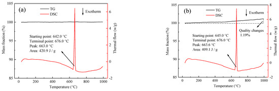 TG/DSC curve of wires in an air atmosphere: (a) aluminum alloy wires; (b) aluminum wires.