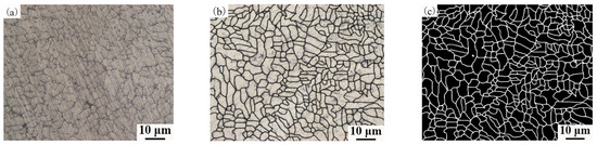 To scientifically and quantitatively analyze the grain diameter, the metallographic structure needs to be processed. Figure 5 shows the binarization process for the metallographic structure of the aluminum alloy wires OABs. Figure 5a shows the original metallographic structure of the aluminum alloy wires. First, the Photoshop software was used to sharpen the appearance of the grains, as displayed in Figure 5b. Second, the Image-Pro-Plus software was used to process the image, the pixels with a gray level of 0 were defined as grain boundaries, and the pixels with a gray level of 255 were defined as grains. In addition, the Count/Size option was used and the Automatic Bright Objects feature was selected to evaluate the grain size.