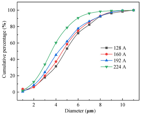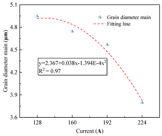 Figure 7 shows the cumulative percentage of grain sizes at different currents. Figure 7 shows that the larger the current is, the steeper the slope of the cumulative curve, especially when the grain size is smaller. The relationship between the average particle size of the OABs and the current is shown in Figure 8. According to Figure 8, as the current increases, the average grain size of the crystals gradually decreases. Therefore, the current is concluded to have a refining effect on the OAB grains. Nonlinear fitting of the grain size and current was carried out, and the overcurrent intensity and the grain size satisfied a quadratic function. The change in grain size is related to the degree of undercooling. At 128 A, the Joule heat and arc temperature are lowest, the undercooling degree of the molten marks is smaller, the radius of the crystal nuclei is larger, and the final grain size is largest. Conversely, at 224 A, the Joule heat and arc temperature are highest, the degree of undercooling is lower, the nucleation radius is smallest, and the grain size is relatively small.