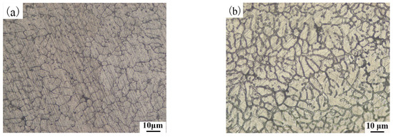 Figure 9 shows the metallographic structures of the 160 A OABs in aluminum alloy and aluminum wires. The aluminum alloy and aluminum wires OABs have the same structure, consisting of cellular dendrites, and the grain boundaries are well-defined and complete. Notably, the aluminum alloy wire OABs are finer, whereby the alloying element refined the grains.