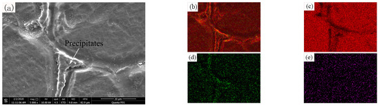 The second phase dissolves and diffuses after an overcurrent fault occurs in the aluminum alloy wires. SEM/EDS was used to map and analyze the OABs of the aluminum alloy wires and aluminum wires. Figure 10 shows the microscopic morphology and element distribution of the OABs of aluminum alloy wires with a 160 A overcurrent. Figure 10b shows that the distribution of elements in the grains is not uniform; as shown in Figure 10d, Fe segregates at the grain boundaries. Because of Joule and arc heating, the molten marks cause the second phase to dissolve and diffuse. The atomic radius of Fe is larger than that of Al. If an Fe atom enters the lattice, it can cause large lattice distortions, which increase the energy of the system. However, the grain boundary atoms are arranged more loosely, and the distortion energy caused by Fe in the grain boundaries is much smaller than that generated by Fe in the lattice. To reduce the energy of the system, the Fe atoms can only be arranged at irregular grain boundaries, and thus, grain boundary segregation occurs. An undissolved Si-rich phase is also found in Figure 10e. Because the arc temperature distribution is not uniform, a part of the Al-Si phase is not melted.