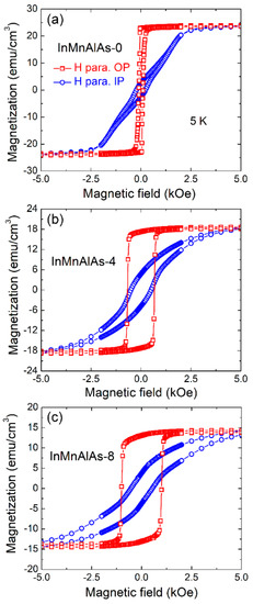 - Rushforth, A.W.; Wang, M.; Farley, N.R.S.; Campion, R.P.; Edmonds, K.W.; Staddon, C.R.; Foxon, C.T.; Gallagher, B.L. Molecular beam epitaxy grown (Ga,Mn)(As,P) with perpendicular to plane magnetic easy axis. J. Appl. Phys. 2009, 104, 073908. [Google Scholar] [CrossRef] [Green Version]