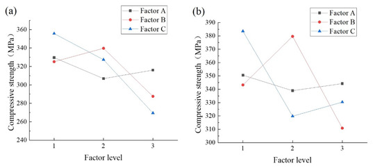 A comparison of the K-values in Figure 2 indicates that for factor A, the strength is the highest at a microcapsule content of 1%, indicating that an increase in the microcapsule content reduces the concrete strength, but the strength reduction is not significant at contents of 3% and 5%. For factor B, the concrete strength is the highest at 50% sodium silicate. For factor C, the compressive strength of concrete decreases with the sodium fluosilicate content, which is consistent with the conclusion that a high content of sodium fluosilicate reduces the compressive strength of concrete.