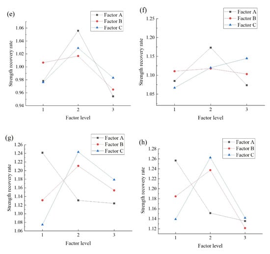 K-value of the compressive strength recovery rate for various factors. (a) 100% damage of specimens at 7 d. (b) 90% damage of specimens at 7 d. (c) 80% damage of specimens at 7 d. (d) 70% damage of specimens at 7 d. (e) 100% damage of specimens at 28 d. (f) 90% damage of specimens at 28 d. (g) 80% damage of specimens at 28 d. (h) 70% damage of specimens at 28 d.
