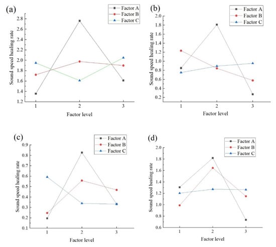 For the sound speed recovery rate, the largest F-values are obtained for the microcapsule content, which is consistent with the concrete healing rate under a high damage load. The confidence level for the microcapsule dosage is more than 75%, whereas that of the other two factors is almost zero. Figure 4 shows that the K-values of factors B and C are relatively gentle, and the maximum sound speed recovery rate is obtained at 3% dosage; thus, the optimal factor level of the sound speed recovery rate of factor A is 3%.