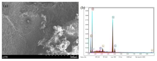 Microcapsule self-healing wall material in the concrete after crushing. (a) Micromorphology. (b) EDS results.