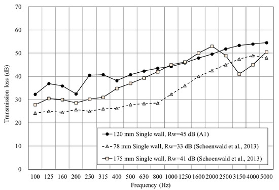 Herein, confirmative wood or timber material is considered a disadvantage compared with other building elements regarding sound insulation performance. Previous research has pointed out that in the sound insulation performance of single-board CLT, is 34 dB of 100 mm CLT [17]. When Schoenwald et al. [18] proposed a thickness with 78 mm and 175 mm of CLT, the sound insulation index was 33 dB and 41 dB, respectively.