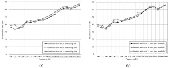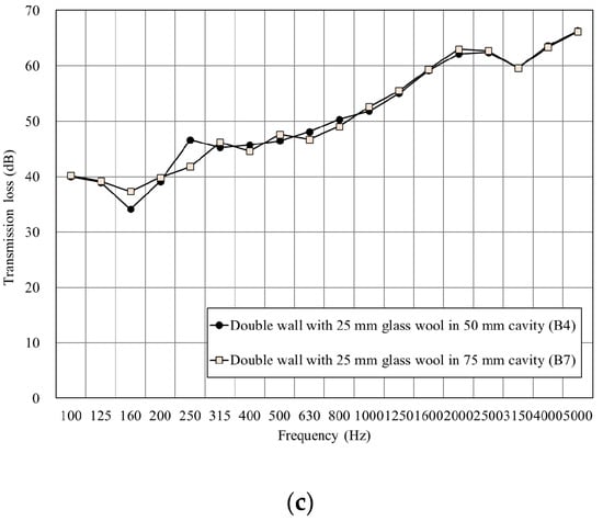 As shown in Figure 7a, increasing the thickness of the cavity from 25 mm to 75 mm can improve the sound insulation on medium and high frequencies by 1 dB–3 dB. Furthermore, the double-wall resonance that occurred at 125 Hz and 160 Hz influenced the sound insulation performance. Figure 7b,c shows that the double wall was filled with glass wool in the cavity, which made few differences in the overall sound insulation performance, only increasing by 2 dB–3 dB at 500 Hz. This result shows that the small surface density of glass wool and a thin cavity cannot provide higher sound insulation performance, while the trend of transmission loss was similar.