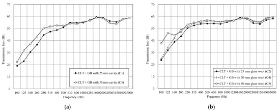 In this study, the double wall and CLT + GB demonstrated a sound insulation performance of greater than 50, except for C1. Filling with glass wool or changing the thickness of the cavity within the range of 50 mm, had less influence on the overall performance, and the improvement effect was below 2 dB. The transmission loss of CLT + GB had advantages in all frequency bands, which can increase the overall performance by 3 dB.