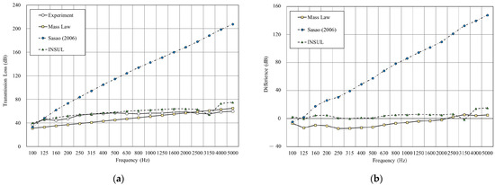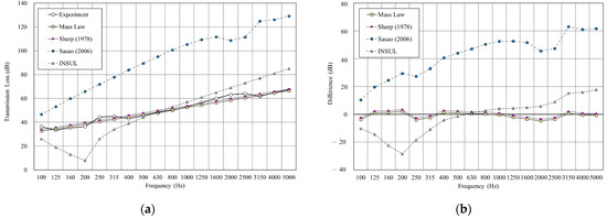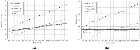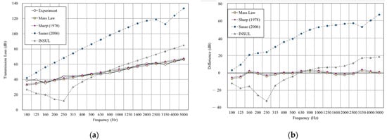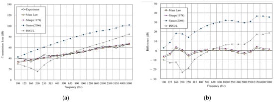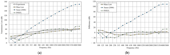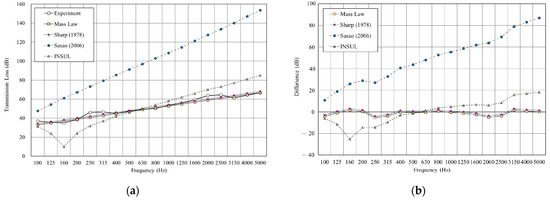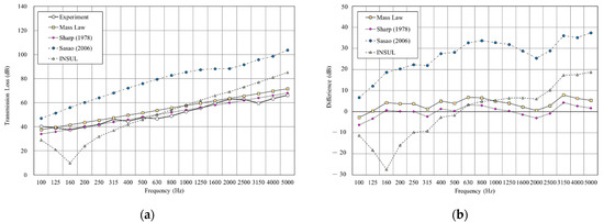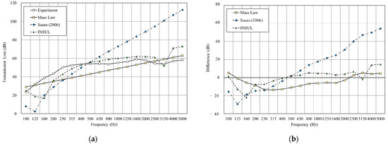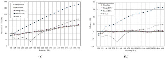 This study used three theoretical prediction models and INSUL [25] for discussion and analysis. We integrated the applicability of the predicted models via the difference in sound insulation performance between experimental and predicted results.