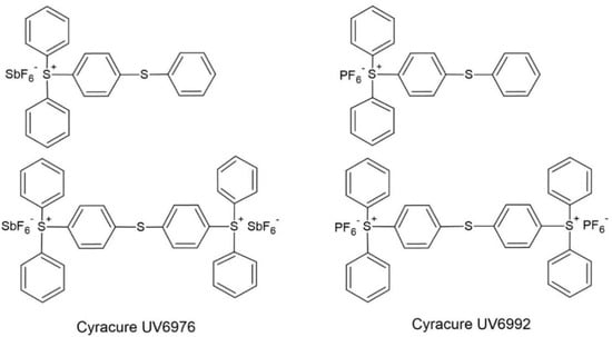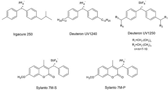 - Sangermano, M. Advances in cationic photopolymerization. Pure Appl. Chem. 2012, 84, 2089–2101. [Google Scholar] [CrossRef]
