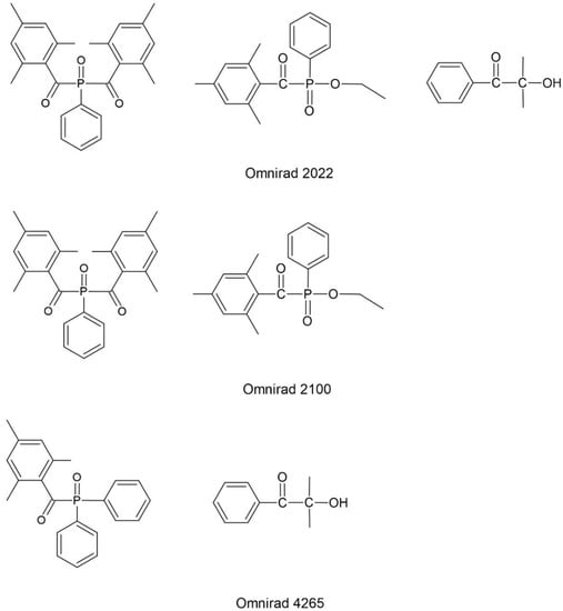 - Gziut, K.; Kowalczyk, A. Influence of radical photoinitiators on features of polyacrylate syrups and self-adhesives. Polimery 2020, 65, 268–274. [Google Scholar] [CrossRef]