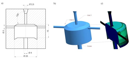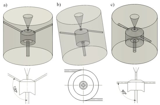 Three design solutions were analysed, in which the side openings were located: at an angle of 120° to the head axis (Figure 2a), tangent to the swirl chamber (Figure 2b), and perpendicular to the swirl chamber (Figure 2c). For each head design, the pressure and velocity vectors distributions inside the self-excited pulse head were determined. The parameters tested and their scope in a full factorial experiment are presented in Table 1.