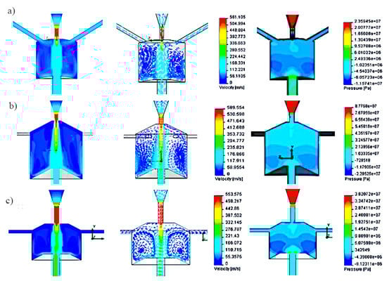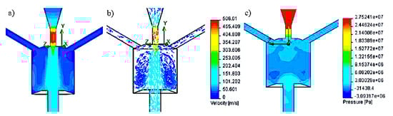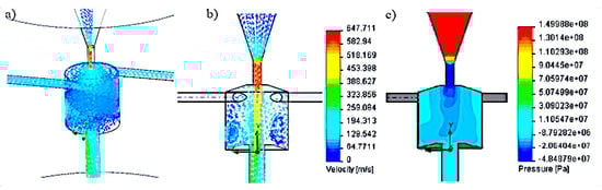 Graphical interpretation of velocity and pressure distributions for selected head solutions with different locations of side openings: (a) inclined at an angle of 120° to the axis of the head; (b) tangential to the swirl chamber; (c) perpendicular to the axis of the head.